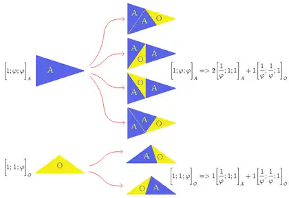 - Tout triangle d'or aigu (A) de dimensions [1 ; φ ; φ] peut se décomposer (de quatre façons différentes, deux à deux symétriques) en trois triangles : un triangle d'or obtus [1/φ ; 1/φ ; 1] et deux triangles d'or aigus [1/φ ; 1 ; 1], ces nouveaux triangles ayant donc, par rapport au triangle d'or générateur, une taille divisée par φ ;
