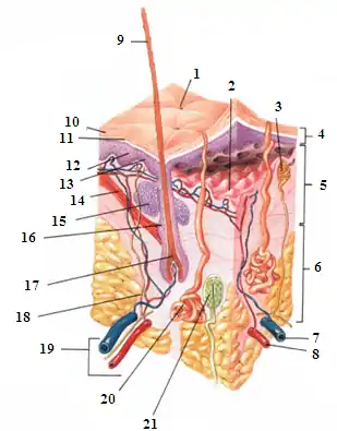 - la partie superficielle, la plus mince, nommée : épiderme. Elle est rattachée à une partie inférieure (4 sur le diagramme) ;