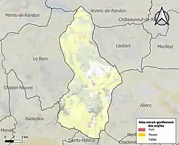 Le retrait-gonflement des sols argileux est susceptible d'engendrer des dommages importants aux bâtiments en cas d’alternance de périodes de sécheresse et de pluie. Aucune partie du territoire de la commune n'est en aléa moyen ou fort (15,8 % au niveau départemental et 48,5 % au niveau national). Sur les 165 bâtiments dénombrés sur la commune en 2019, aucun n'est en aléa moyen ou fort, à comparer aux 14 % au niveau départemental et 54 % au niveau national. Une cartographie de l'exposition du territoire national au retrait gonflement des sols argileux est disponible sur le site du BRGM[23],[Carte 2].