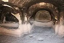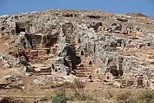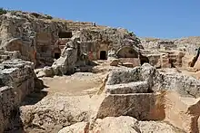 Après cela, on atteint l'ancien village de Perrhé. Au centre du village se trouve la fontaine romaine dominée par une voûte en pierre de 5 mètres de large recouvrant un canal d'eau. Des vestiges des murs de la ville subsistent également. La vaste nécropole contient des sarcophages autoportants et de simples niches funéraires voûtées, ainsi que des catacombes, souvent composées de plusieurs pièces, avec des niches voûtées creusées dans la falaise et irrégulièrement séparées par des pilastres. La plupart des tombes sont regroupées en sections accessibles par des escaliers creusés dans la falaise à différents endroits. Certaines tombes conservent encore des restes de reliefs devant les entrées, mais il n'y a aucune autre décoration.