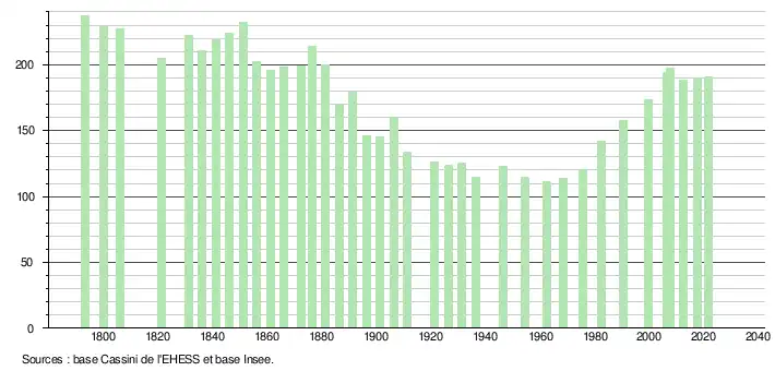L'évolution du nombre d'habitants est connue à travers les recensements de la population effectués dans la commune depuis 1793. Pour les communes de moins de 10 000 habitants, une enquête de recensement portant sur toute la population est réalisée tous les cinq ans, les populations légales des années intermédiaires étant quant à elles estimées par interpolation ou extrapolation[15]. Pour la commune, le premier recensement exhaustif entrant dans le cadre du nouveau dispositif a été réalisé en 2007[16].