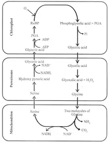 La photorespiration est l'ensemble des réactions mises en œuvre par les organismes photosynthétiques à la suite de l'activité oxygénase de la Rubisco. En effet, cette enzyme intervient le plus souvent à travers son activité carboxylase, par laquelle une molécule de dioxyde de carbone CO2 est fixée sur du ribulose-1,5-bisphosphate pour donner deux molécules de 3-phosphoglycérate qui sont métabolisées par le cycle de Calvin. Cependant, la Rubisco peut également oxyder le ribulose-1,5-bisphosphate par une molécule d'oxygène O2, ce qui donne une molécule de 3-phosphoglycérate et une molécule de 2-phosphoglycolate. Ce dernier ne peut être directement métabolisé par le cycle de Calvin et passe par une série de réactions qui, chez les plantes, font intervenir les chloroplastes, les peroxysomes et les mitochondries des feuilles, où ces organites sont proches les uns des autres. Il y a alors production de glycolate HOH2C–COO−, de peroxyde d'hydrogène H2O2 et de sérine HOH2C–CH(NH2)–COOH, recyclés en libérant du CO2 et de l'ammoniac NH3. Le résultat est une perte nette en matière organique, susceptible de représenter le quart du dioxyde de carbone fixé par photosynthèse[1].