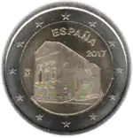 Église Santa María del Naranco à Oviedo surmontée de la mention du pays émetteur ESPAÑA et du millésime 2017. L'anneau externe de la pièce comporte les douze étoiles du drapeau européen. | ||||||
