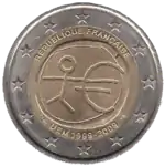 Tous les pays de la zone euro ont émis le 1er janvier une pièce commémorative de 2 € pour célébrer le 10e anniversaire de l'Union économique et monétaire. Le centre de la pièce illustre une silhouette humaine stylisée dont le bras gauche est prolongé par le symbole de l'euro. Le nom du pays émetteur RÉPUBLIQUE FRANÇAISE apparaît dans la partie supérieure, tandis que l'indication 1999-2009 et l'acronyme UEM (pour Union économique et monétaire) apparaissent dans la partie inférieure. L'anneau externe de la pièce représente les douze étoiles du drapeau européen. | ||||||