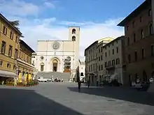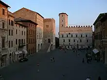 Elle rassemble plusieurs monuments de caractère médiéval parmi lesquels la cathédrale de la Santissima Annunziata édifiée au XIIe siècle, qui fait face au Palazzo dei Priori du XIVe siècle, vaste construction crènelée avec une tour pentagonale. Situés côte à côte, le Palazzo del Popolo (hôtel de ville) daté de 1214, ce qui en fait l'un des plus anciens d'Italie, et le Palazzo del Capitano construit en 1290 en style gothique italien. Depuis la place, ces deux derniers édifices sont accessibles par des escaliers communs. Ils sont le siège de la mairie et du musée civico.