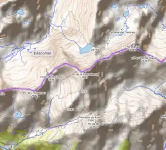 Le pic est sur le territoire de la commune de Siguer sur le versant français et sur la paroisse d'Ordino sur le versant andorran. Le riu de Rialb prend sa source sur le versant sud-est. Le sommet est situé en limite du parc naturel régional des Pyrénées ariégeoises[8] et du parc naturel de Sorteny.
