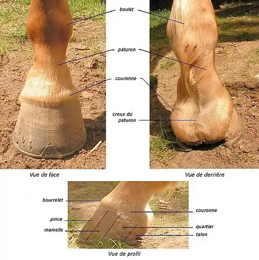 L'extrémité des membres du cheval est composé, de haut en bas, du canon (vertical), de l'articulation du boulet et de son fanon, poils plus longs situés à l'arrière du boulet. Le pied à proprement parler comporte le paturon, la couronne et le sabot[18]. La couronne se termine par le bourrelet périoplique ou bourrelet principal. Le périople est une bande de corne un peu plus molle, situé au bord supérieur de la paroi, et se confond en arrière avec la fourchette. Il sécrète un vernis (le périople) protégeant la corne du dessèchement[18]. Le bourrelet principal, au niveau de la couronne, sécrète la corne constituant la paroi du sabot. La pousse de la paroi se fait donc de haut en bas[5].