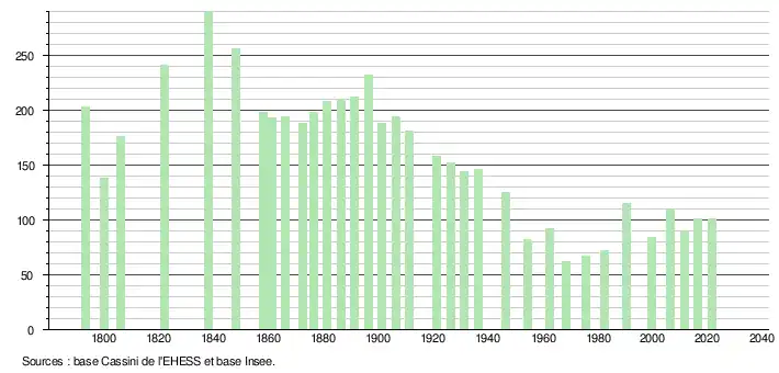 L'évolution du nombre d'habitants est connue à travers les recensements de la population effectués dans la commune depuis 1793. Pour les communes de moins de 10 000 habitants, une enquête de recensement portant sur toute la population est réalisée tous les cinq ans, les populations légales des années intermédiaires étant quant à elles estimées par interpolation ou extrapolation[24]. Pour la commune, le premier recensement exhaustif entrant dans le cadre du nouveau dispositif a été réalisé en 2006[25].
