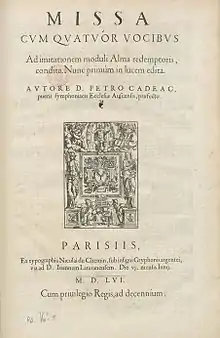 - Petri Cadeac musici excellentissimi moteta, quatuor, quinque & sex vocum. Liber primus. - Paris : Adrian Le Roy et Robert Ballard, 1555. RISM C 13 = Lesure 1955 n° 15.