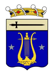 "D'azur à la lyre d'or, accostées de deux étoiles d'argent; au chef d'argent chargée d'une épée en face de sable, la pointe à semestre"