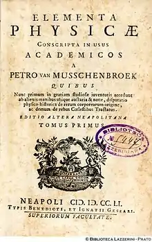 - En 1760 Musschenbroek décide de publier un ouvrage plus complet, en particulier sur la partie concernant l'électricité. Compte tenu de sa mort, intervenue en 1761, la nouvelle édition est terminée par son disciple Jean Lulofs (nl), et parait en deux tomes en 1762 sous le titre de Introductio ad philosophiam naturalem (OCLC 16225246) ;