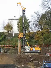 Les pieux ou pilots sont en bois de hêtre, sapin, chêne ou en béton armé, et l'ensemble des pieux forme ce que l'on appelle le pilotis. Les pieux sont terminés, à la partie inférieure, par une pointe en fer forgé et leur tête garnie d'une frette également en fer, destinée à empêcher que le bois ou le béton ne se gerce, ou ne s'écrase sous les coups de mouton. Les pieux sont battus en force dans le sol ou enfoncés par vibration (Vibrofonçage). Le battage s'effectue grâce à la chute d'une masse de fonte ou en fer de 500 kilogrammes, appelée Sonnette ou mouton, qui heurte la tête du pieux et provoque son enfoncement dans le sol. Le battage se poursuit jusqu'à obtenir un « refus », c'est-à-dire l'incapacité d'obtenir un enfoncement plus important. Une volée est une suite ininterrompue de 30 coups environ: après chaque volée on mesure l'enfoncement ; si celui-ci après plusieurs volées ne présente plus qu'une quantité négligeable, on dit que le pilot est battu à refus[6]. Les pieux sont liaisonnés par le dessus par des poutres, ce que l'on nomme « radier ».