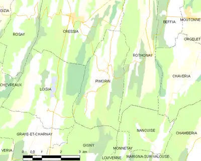 Le village se situe à une altitude de 527 m. Il est traversé par les ruisseaux de la Doye, du Bourgeau, et de Bellecombe, ce dernier séparant le territoire de Pimorin de celui de Cressia.