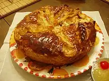 La pâte est fabriquée à partir d'une pâte brisée, ou feuilletée et de levure.