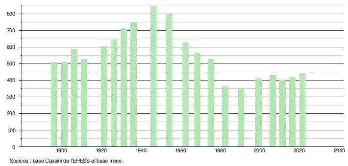 L'évolution du nombre d'habitants est connue à travers les recensements de la population effectués dans la commune depuis 1896. Pour les communes de moins de 10 000 habitants, une enquête de recensement portant sur toute la population est réalisée tous les cinq ans, les populations légales des années intermédiaires étant quant à elles estimées par interpolation ou extrapolation[14]. Pour la commune, le premier recensement exhaustif entrant dans le cadre du nouveau dispositif a été réalisé en 2006[15].
