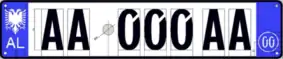 La plaque d'immatriculation albanaise comporte une bande bleue sur les deux côtés. La bande de gauche est ornée d'un aigle bicéphale de couleur blanche et mentionne, juste en dessous, le code international AL en caractères blancs. La bande de droite a un cercle blanc.