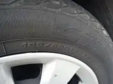 - 65 est la « série » (hauteur du flanc par rapport à la largeur du pneu ou rapport h/l) exprimée en pourcentage (ici 65 % - soit 127 mm). Si cette indication n'apparaît pas (en général, pneus anciens), il s'agit par défaut d'une série 82 (aujourd'hui équivalente à un pneu marqué 80) ;