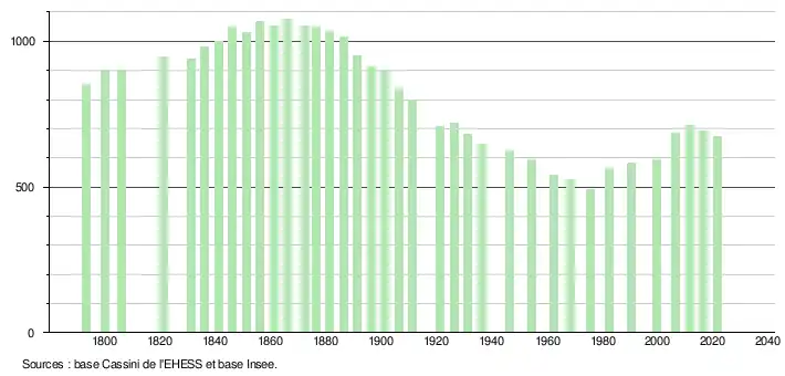 L'évolution du nombre d'habitants est connue à travers les recensements de la population effectués dans la commune depuis 1793. Pour les communes de moins de 10 000 habitants, une enquête de recensement portant sur toute la population est réalisée tous les cinq ans, les populations légales des années intermédiaires étant quant à elles estimées par interpolation ou extrapolation[18]. Pour la commune, le premier recensement exhaustif entrant dans le cadre du nouveau dispositif a été réalisé en 2006[19].