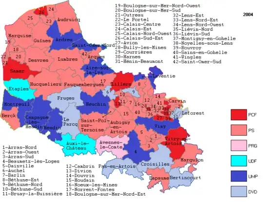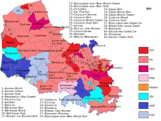 - 2e circonscription : cantons d'Arras-1 (sauf commune de Beaumetz-lès-Loges), Arras-2 (sauf commune de Monchy-le-Preux), Arras-3 (6 communes), Brebières (6 communes), Bully-les-Mines (4 communes) et Liévin (communes de Givenchy-en-Gohelle et Vimy), communes d'Acheville, Bois-Bernard et Duisans.
