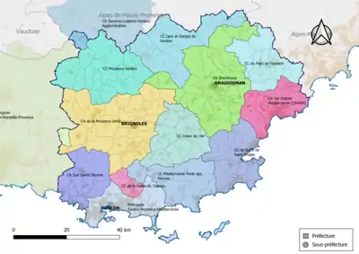 La préfecture du Var est localisée à Toulon. Le département possède en outre trois sous-préfectures à Brignoles et Draguignan. L'arrondissement de Grasse a été transféré dans le département des Alpes-Maritimes en 1860.