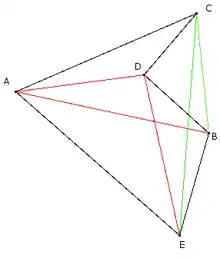 Par exemple, le pentagone simple ACDBE ci-contre est non convexe car les diagonales [B, C] et [C, E] ne sont pas dans l'intérieur du polygone. Le segment ouvert ]B, C[ est même complètement à l'extérieur. L'existence d'une telle « bouche » est une propriété générale des polygones simples non convexes[5].