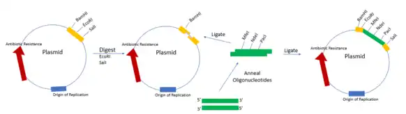 Dans certains cas, un vecteur peut ne pas contenir un MCS, dans ce cas, un MCS peut être ajouté à un vecteur, cette même méthode peut être utilisée pour ajouter de nouveaux sites de restriction pour un site de clonage multiple[4]. La première étape est de concevoir des oligonucléotides complémentaires de séquences qui contiennent l'enzyme de restriction sites ainsi que d'autres bases sur la fin qui sont complémentaires du vecteur après digestion. Ensuite, les séquences d'oligonucléotides peuvent se réapparier et être ligaturés dans le vecteur digéré et purifié. Le vecteur digéré est coupé par une enzyme de restriction qui complète l'oligonucléotide. Après la ligature, le vecteur peut être transformé dans des bactéries. Le séquençage permet de vérifier l'insertion.