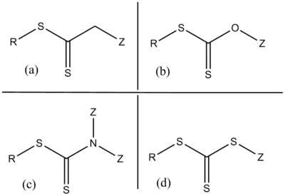 Une grande diversité d'agents de transfert de type RAFT sont disponibles ou bien assez aisément synthétisables. Les principaux agents de transfert thiocarbonylthio sont les dithiocarbonate (a), xanthate (b), dithiocarbamate (c) et trithiocarbonate (d).