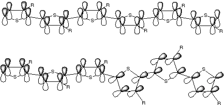 Les systèmes p étendus de PT conjugués produisent une des propriétés les plus intéressantes de ces matériaux, leurs propriétés optiques. En première approximation, le squelette conjugué peut être considéré comme un exemple réel de la solution de l'« électron dans une boîte » de l'équation de Schrödinger ; cependant, le développement de modèles plus fins pour prédire de manière fine les spectres d'absorption et de fluorescence de systèmes d'oligo-thiophènes bien définis est en cours[17]. La conjugaison repose sur la superposition des orbitales p des cycles aromatiques, qui, en retour, nécessite que les cycles de thiophène soient coplanaires (voir figure 2, en haut).