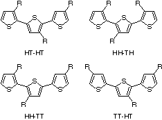 L'asymétrie des thiophènes trisubstitués conduit à trois couplages possibles lorsque deux monomères sont reliés entre les positions 2 et 5. Ces couplages sont :