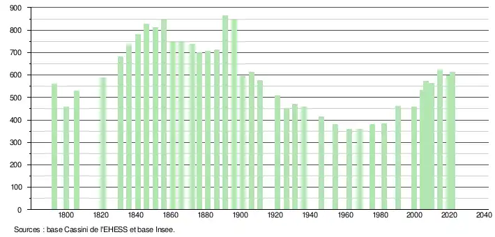 | L'évolution du nombre d'habitants est connue à travers les recensements de la population effectués dans la commune depuis 1793. Pour les communes de moins de 10 000 habitants, une enquête de recensement portant sur toute la population est réalisée tous les cinq ans, les populations légales des années intermédiaires étant quant à elles estimées par interpolation ou extrapolation[41]. Pour la commune, le premier recensement exhaustif entrant dans le cadre du nouveau dispositif a été réalisé en 2004[42]. En 2021, la commune comptait 614 habitants[Note 7], en diminution de 2,54 % par rapport à 2015 (Haute-Garonne : +7,43 %, France hors Mayotte : +1,84 %). |