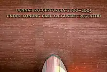 Comme pour le pont Est, une inscription figure sur le côté du nouveau pont, près de la rive nord de la baie d'Årsta. On peut y lire : « ce pont a été construit sous le règne du roi Charles XVI Gustave entre 2000 et 2005 ».