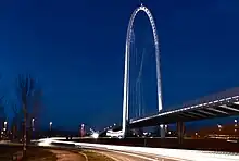 La connexion entre le tablier et l'arche se fait au moyen de 50 paires de câbles en acier. Le pont est structuré en deux voies par sens de circulation avec des séparateurs de trafic et des sentiers piétons protégés en verre feuilleté, pour une largeur totale du tablier suspendu en acier 27 mètres et pour un poids total de 4 000 tonnes d'acier entièrement soudé[4]. L'ouvrage a été achevé en 2006.