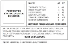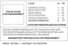Lors des phases d'exploration, l'environnement s'affiche en trois dimensions avec un rectangle en haut à gauche de l'écran qui affiche ce que voit le groupe, le reste de l'écran étant occupé par des informations textuelles concernant le groupe et la zone explorée[15]. Le joueur peut accéder à des menus pour donner des ordres à ses personnages : utiliser, échanger, acheter ou vendre un objet, parlementer avec un ennemi, et apprendre ou lancer un sort. Il peut observer les déplacements des personnages selon différents angles, incluant une vue aérienne[16]. Le jeu utilise trois versions de chaque sprite pour indiquer la différence de distance qui sépare le groupe des prochaines rencontres[2].