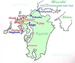 Ce style va prendre le nom de son port d'exportation, Imari (伊万里). Le port d'Imari est situé dans la Préfecture de Saga, au nord de l'île de Kyūshū, à quelques kilomètres d'Arita. En 1641, la V.O.C. est tenue, pour des mobiles politiques, de transférer plus au sud ses installations d'Imari et d'Hirado en aval, sur l'îlot de Deshima (ou Dejima dans la baie de Nagasaki).