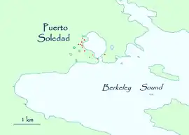 Carte de Puerto Soledad; à noter le vieux fort pentagonal, le corral et le cimetière.