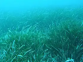 La Posidonie de Méditerranée (Posidonia oceanica) est une espèce de plantes à fleurs aquatique de la famille des Posidoniaceae et endémique de la mer Méditerranée[N 1]. Ce n'est pas une algue, bien qu'elle vive sous l'eau ; il s'agit d'une « herbe marine », en fait une plante angiosperme monocotylédone sous-marine à fleurs. Comme toutes les plantes à fleurs, elle a des racines, une tige qui est ici rhizomateuse, et des feuilles rubanées[N 2] mesurant jusqu'à un mètre de long et disposées en touffes de 6 à 7. Elle fleurit en automne et produit au printemps des fruits flottants communément appelés olive di mare (« olives de mer ») en Italie.