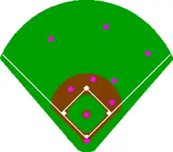 - 7. 8. et 9. Joueur de champ extérieur : les joueurs de champ extérieur sont très souvent choisis pour la qualité de frappe. Ils doivent être des coureurs rapides pour atteindre la balle frappée en l'air. Le joueur du champ centre est souvent le plus rapide, parce qu'il doit atteindre les balles frappées au champ droit et au champ gauche. Ils peuvent enregistrer des assistances aussi en lançant la balle à un joueur de champ intérieur quand un coureur est en train d'avancer vers la prochaine base. Les assistances sont relativement rares[3],[4]. Celui qui lance le mieux est souvent le champ droit, parce qu'il est le plus loin de la 3e base.