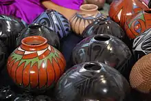 Après la peinture, les pots sont cuits à ciel ouvert ou dans des fours à fosse. Deux ou trois petits pots peuvent être cuits ensemble, mais les plus grands sont cuits individuellement. Ils sont posés sur un tas de bouse de vache séchée et de bois et, s'ils sont cuits à ciel ouvert, recouverts d'un grand pot renversé appelé « saggar »[4],[6].. Pour les pots polychromes, l'air peut circuler à l'intérieur de la chambre de cuisson. Si les pots doivent devenir noirs, la chambre est scellée pour garder la fumée à l'intérieur et l'air à l'extérieur. Lydia Quezada est à l'origine de la variation noire. Elle dit qu'elle a appris à le faire lorsqu'elle a accidentellement scellé la chambre pour un pot polychrome, créant des nuages noirs. L'effet l'a amenée à expérimenter davantage[4].