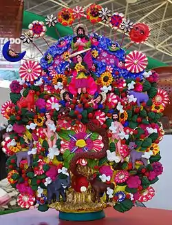 Cependant, Metepec est plus connu pour ses objets plus décoratifs et artistiques. Les plus importants d'entre EUX sont les sculptures de l'arbre de vie qui ont des fonctions à la fois religieuses et décoratives[17],[18]. À l'origine, il s'agiT de pièces représentant l'histoire du Jardin d'éden (souvent représenté avec la flore et la faune mexicaines), mais depuis, elles se sont développées avec divers motifs et thèmes ainsi que des tailles allant de la miniature au monumental[2]. Les arbres classiques de la vie sont à trois niveaux, avec Dieu représenté au plus haut niveau. Le niveau moyen représente le paradis d'Éden et le niveau inférieur la fuite d'Adam et Ève du jardin après leur expulsion. Les arbres sont remplis de fleurs, d'oiseaux, d'animaux et plus encore. Les représentations de Dieu varient et sont parfois accompagnées d'anges et d'autres figures célestes[2]. Cependant, des arbres sont réalisés avec d'autres motifs, y compris des motifs séculaires et historiques. Un arbre de vie avec un motif de la Vierge de Guadalupe est au Vatican[18].