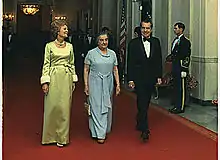 Lors de son entrée en fonction, le président fit une déclaration de politique étrangère, connue sous le nom de « doctrine Nixon », selon laquelle les États-Unis « ne prendraient pas en charge la défense de toutes les nations du monde libre ». En conséquence, si les engagements en cours seraient poursuivis, une potentielle intervention supplémentaire du pays à l'étranger ferait dorénavant l'objet d'une évaluation scrupuleuse. Plutôt que de prendre part directement aux conflits, Nixon déclara que les États-Unis fourniraient un appui militaire et économique aux pays menacés par des insurrections ou des invasions en règle ou encore situés dans des régions vitales aux intérêts américains[113]. En vertu de cette doctrine, les États-Unis augmentèrent fortement leurs ventes d'armes au Moyen-Orient, notamment à Israël, l'Iran et l'Arabie saoudite[114]. Un autre grand bénéficiaire de cette aide fut le Pakistan qui obtint le soutien des États-Unis lors de la guerre indo-pakistanaise de 1971[115].