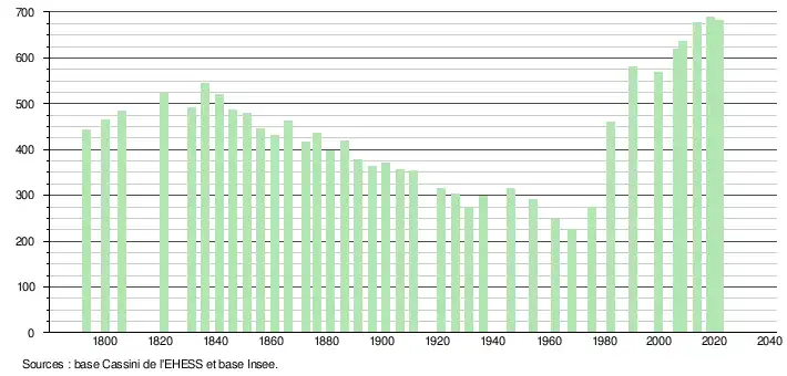L'évolution du nombre d'habitants est connue à travers les recensements de la population effectués dans la commune depuis 1793. Pour les communes de moins de 10 000 habitants, une enquête de recensement portant sur toute la population est réalisée tous les cinq ans, les populations légales des années intermédiaires étant quant à elles estimées par interpolation ou extrapolation[4]. Pour la commune, le premier recensement exhaustif entrant dans le cadre du nouveau dispositif a été réalisé en 2008[5].
