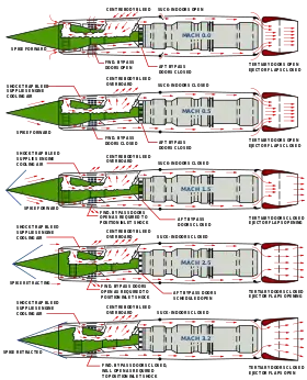 En effet, il apparut rapidement que, en raison de l'encombrement du moteur (imposé par les contraintes liées à la cellule), un véritable goulet d'étranglement serait constitué à partir d'un nombre de Mach élevé, empêchant le moteur d'utiliser l'air en provenance de la veine d'aspiration. Pour résoudre cette problématique, six veines de dérivation furent mises en place, conduisant l'air prélevé dans le 4e étage du compresseur directement aux chambres de combustion, qui étaient ainsi refroidies tout en faisant bénéficier le moteur d'un accroissement de poussée. Dans les faits, ces veines de dérivation, fixes, permettaient à la partie postérieure du moteur de fonctionner comme un véritable statoréacteur.