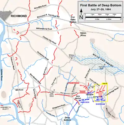 Grant ordonne au IIe corps de l'armée du Potomac, commandé par le major général Winfield S. Hancock, et à deux divisions du corps de cavalerie du major général Philip H. Sheridan de traverser la rivière à Deep Bottom avec un pont flottant et d'avancer contre la capitale confédérée. Une division du Xe corps (armée de la James), commandée par le brigadier général Robert S. Foster, a déjà traversé sur un deuxième pont flottant, juste en amont pour sécuriser une tête de pont sur la rive nord du fleuve. Le plan de Grant demande à Hancock de clouer les confédérés à Chaffin's Bluff et d'empêcher des renforts adverses contre la cavalerie de Sheridan qui attaquera Richmond, si cela est possible. Si elle ne le peut pas - une situation que Grant considère comme la plus probable - Sheridan a reçu l'ordre de contourner la ville au nord et à l'ouest et de couper le chemin de fer de la Virginie Centrale, qui ravitaille Richmond à partir de la vallée de la Shenandoah[4].