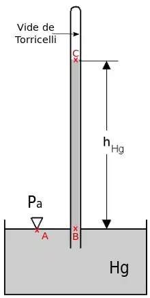 - En hydrostatique, le poids de la colonne de mercure (P=mHgg) est équilibré par le poids de l'air qui appuie sur la totalité de la surface libre du mercure dans la cuve. En rapportant ces deux forces à une même unité de surface, on peut écrire que la pression qui s'exerce sur la surface du mercure contenu dans la cuve (PA = Patm = Pa car le point A est au contact de l'air ambiant) est égale à la pression dans le mercure au niveau de l’ouverture du tube (PB). Dans le tube de Torricelli plongeant dans un bain de mercure (de symbole Hg et de masse volumique ρ), la colonne est surmontée de vide (appelée vide de Torricelli), ou plus précisément de vapeur de mercure à la pression de vapeur saturante (à 20°C, p*(Hg) = 0,16012 Pa). Cette valeur étant négligeable au regard de la pression atmosphérique, on peut admettre que PC ≈ 0. La différence de pression entre deux points B et C (situés à une hauteur telle que hB - hC = h) et hC, situés respectivement à une profondeur hB et hC est donnée par la loi fondamentale de l'hydrostatique pour un fluide incompressible entre différents points :