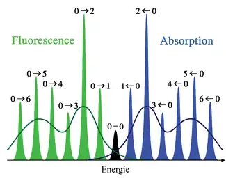 L'applicabilité du principe de Franck-Condon à la fois dans l'absorption et la fluorescence, avec la loi de Kasha, conduit à une symétrie approchée par réflexion (figure 2). La structure vibrationnelle des molécules dans un gaz froid et peu dense est bien plus marquée en raison de l'absence d'élargissement inhomogène des transitions individuelles. Les transitions vibroniques sont représentées dans la figure 2 comme étroites, avec des profils lorentziens espacés régulièrement. Les espacements égaux entre niveaux vibrationnels n'existent que dans le cas d'un potentiel parabolique d'oscillateurs harmoniques simples. Dans le cas de potentiels plus réalistes, tels que ceux montrés figure 1, les écarts énergétiques diminuent avec l'augmentation d'énergie vibrationnelle. Les transitions électroniques depuis et vers les états vibrationnels les plus bas sont parfois désignés comme des transitions 0-0 (zéro-zéro) et ont la même énergie en absorption et fluorescence.
