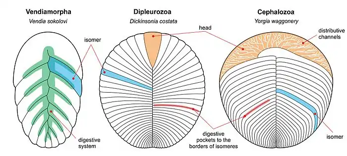 Reconstitution d'un Vendiamorpha (Vendia sokolovi), d'un Dipleurozoa (Dickinsonia costata) et d'un Cephalozoa (Yorgia waggoneri).