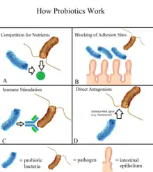 Les mécanismes d'action des probiotiques reposent sur un effet de symbiose en permettant au microbiote intestinal de conserver une dominante majoritairement non-pathogène. Ils moduleraient l’activité du système immunitaire intestinal, en renforçant l’immunité générale quand elle est faible, par exemple chez l'enfant, immature (chez le nouveau-né) ou la personne âgée. À contrario ils pourraient diminuer la sur-activation du système immunitaire, en cas d’allergies ou de maladies inflammatoires de l’intestin, donc en améliorant la fonction de barrière de la muqueuse intestinale par augmentation de la production et qualité du mucus et/ou des anticorps de type IgA[94]. Ils ont un effet anti-pathogènes direct (par compétition) en limitant l'adhésion des pathogènes aux parois intestinales.