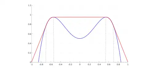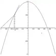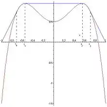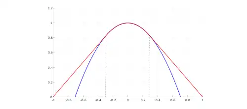 - Par symétrie, comme est une fonction paire, et . Ainsi, atteint son maximum sur au point et est la tangente de au point d'abscisse s'annulant en .