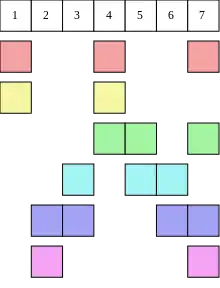 Si dans l'exemple 2 ci-dessus, nous représentons les 6 ensembles A, B, C, D, E et F de sous forme de lignes et les 7 éléments dans U = {1, 2, 3, 4, 5, 6, 7} sous forme de colonnes, alors le problème de la couverture exacte est représenté par la matrice 6×7 :