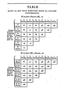 Pascal a développé ces résultats dans le IIIe « usage » de son Traité du triangle arithmétique : « Usage du Triangle Arithmétique pour déterminer les partis qu'on doit faire entre deux joueurs qui jouent en plusieurs parties ». Par la suite, mis au courant des recherches de Pascal au cours d'un voyage à Paris en 1655[5], Christian Huygens publie en 1657 le premier ouvrage mathématique sur cette question, son Sur le calcul ès jeux de hasard[6], repris dans le livre de John Arbuthnot de 1692[7] et en première partie de l'Ars conjectandi de Jakob Bernoulli en 1713[8].